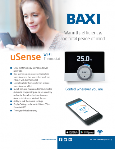 Baxi uSense Wi-Fi Thermostat DiscontinuedECR International Inc.; formerly a BDR Thermea Group company; has been acquired by Granby Industries LP, division of TerraVest Industries Inc. As a result of the acquisition, the Baxi branded communicating thermostat (uSense Wi-Fi thermostat) is no longer available for sale in the United States and Canadian markets. If you currently have a Baxi Wi-Fi thermostat installed in your home, the thermostat will continue to operate by manually turning the thermostat up or down to change your room temperature settings and control your heating system. The server used to operate the Baxi Wi-Fi thermostat remotely will no longer be accessible to users in either the United States or Canada as of January 15th, 2022. This will result in a loss of connectivity and therefore, you will not be able to remotely operate or view the thermostat from your smart phone or tablet device. Under the privacy policy of the Baxi Wi-Fi thermostat, any of your data that currently rests on the server will be permanently deleted. No action is required by you if you choose to keep the Wi-Fi thermostat and operate it manually. If you would like to return the thermostat, ECR International Inc., will compensate you $100.00 upon return and receipt of your Baxi Wi-Fi thermostat along with original proof of purchase. Arrangements for returning your thermostat can be made by contacting the Baxi Customer Service Department at: |